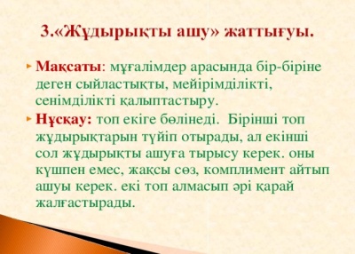 (Ұ). Ұйымдастыру кезеңі: 1. сәлемдесу, түгендеу. 2. Ынтымақтастық атмосферасын қалыптастыру Оқушылар бір-біріне тілек білдіреді, тыңдау дағдыларын дамытуға бағытталады, сондай-ақ барлық оқушылардың қатыстырылуы арқылы сабаққа белсенділігі артады. |