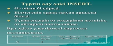 Тапсырма: Жұптық жұмыс Оқулықта берілген тапсырмаларды орындатады, бақылайды, мысал, үлгі көрсетеді. Тапсырма Топтық жұмыс Мұғалім оқуышларға бағыт- бағдар беріп, ынтымақтастықта жұмыс жасауға, ойын анық, дәл, нақты жеткізе білуге баулиды. Тапсырма Жеке жұмыс Мұғалім оқушылардың қате кеткен тұстарына көмек беріп, түзейді. Қосымша ақпарат көздерінен тың мәлімет береді. Қосымша тапсырма Ойтаразы Жеке жұмыс |