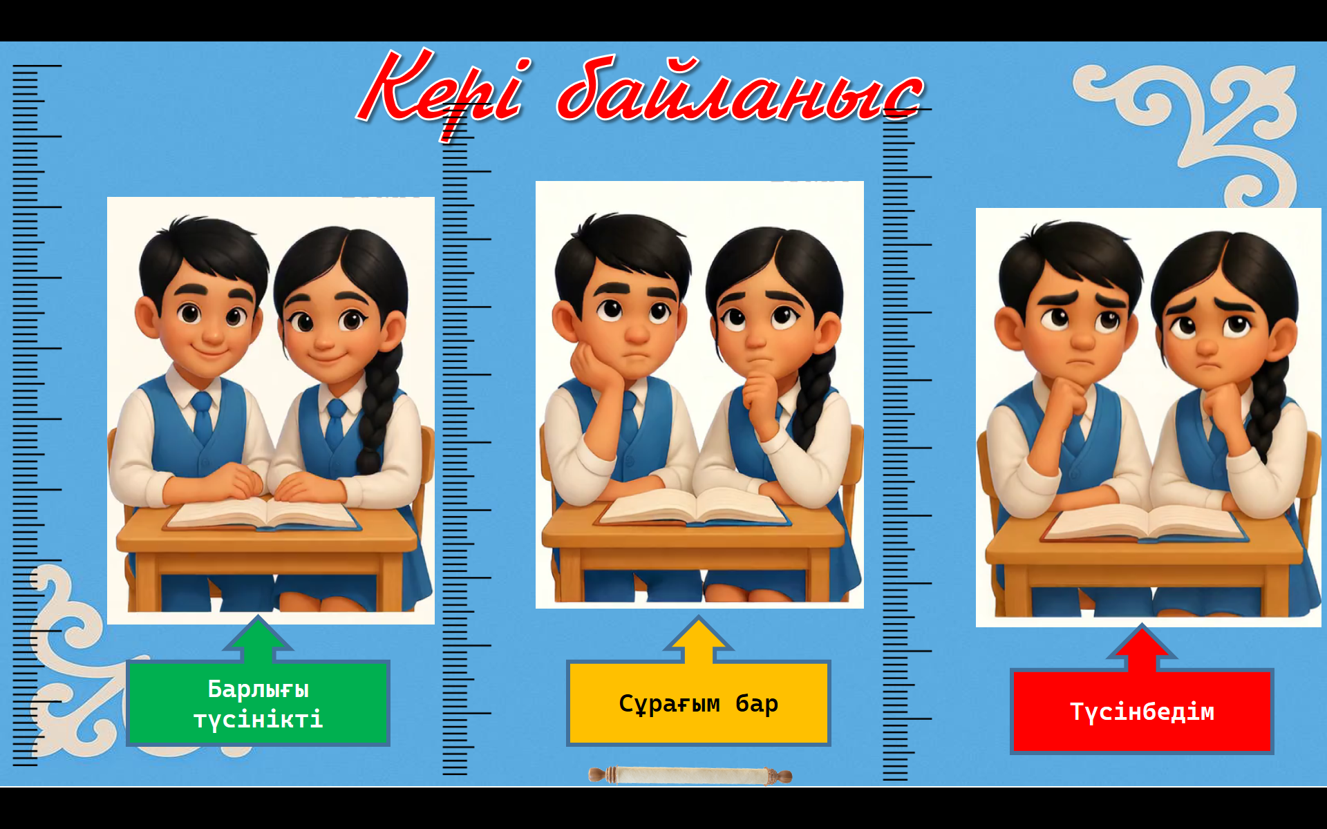Бүгінгі сабақ бойынша ойларымен бөлісіп, кері байланыс береді.