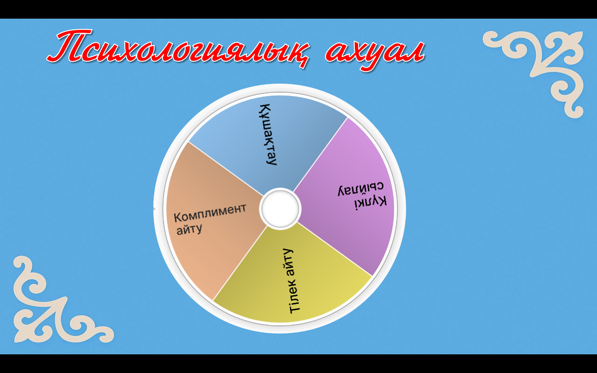 Психологиялық ахуал. https://wordwall.net/ru/resource/62475118 Платформада құрылған “шеңбер” әдісі арқылы жүзеге асады.