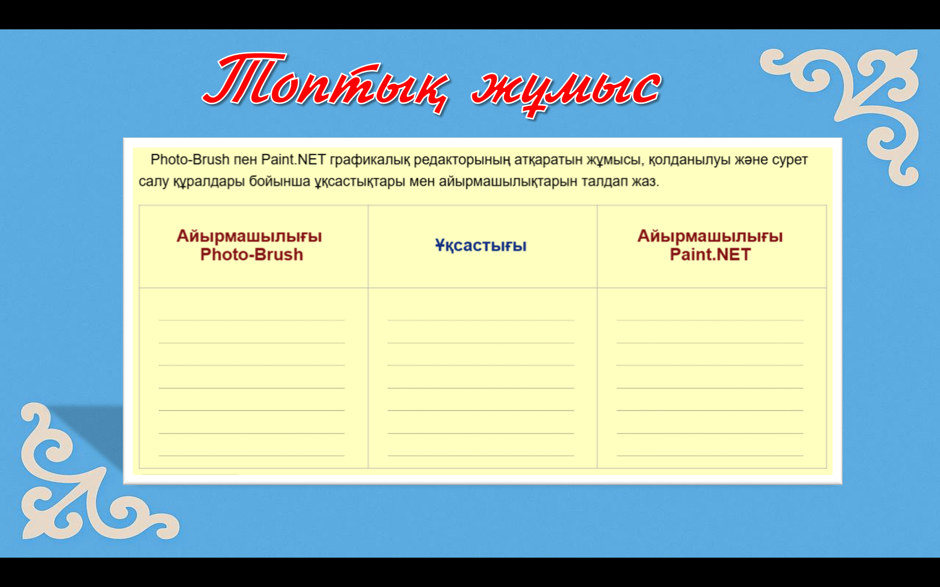 Дескриптор: -программа-лардың айырмашылықтарын жаза-ды; - ұқсастық-тарын жаза-ды. 1 балл
