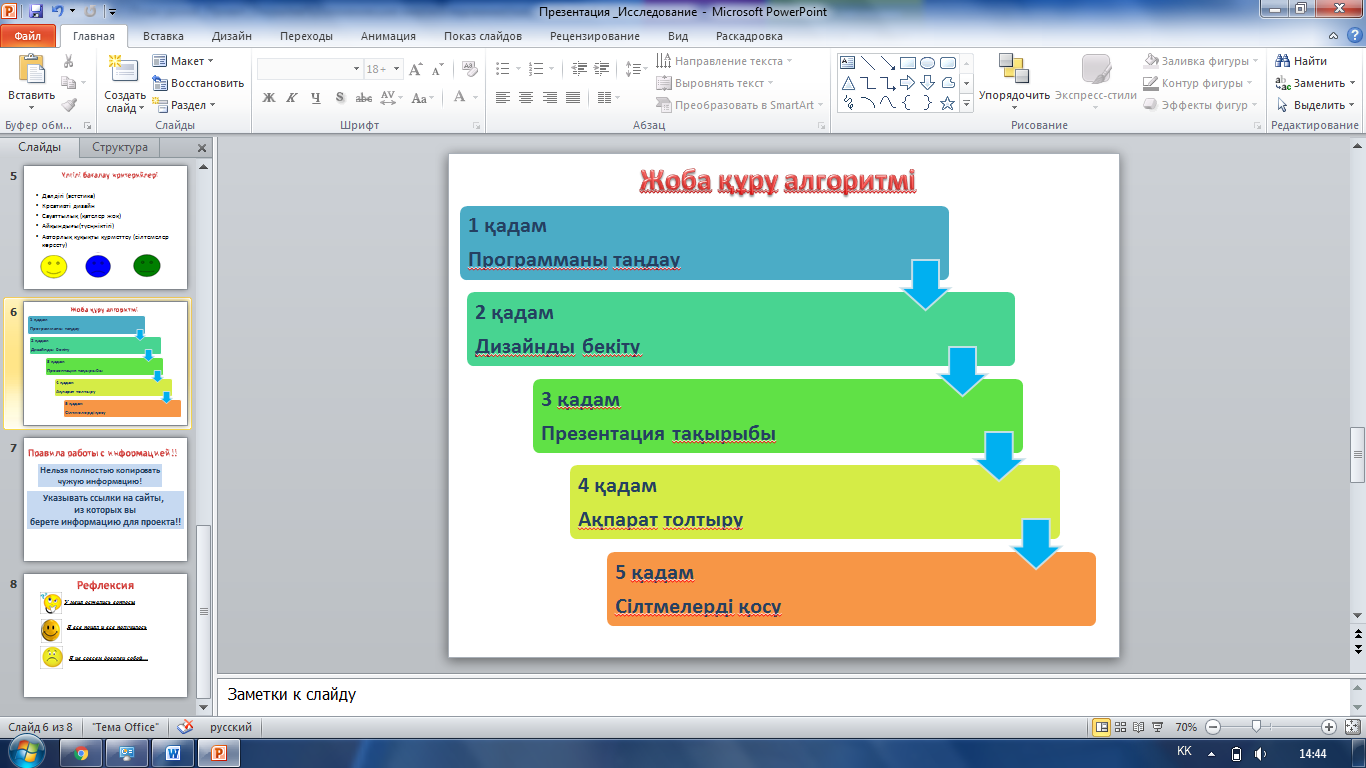 Таңдалған жобаның тақырыбын анықтайды Жобаны іске асыру үшін қажетті ақпаратты таба алады және іріктейді - Жоба құру кезінде ортақ қалтада жұмыс істейді - Аяқталған жобаның бағалау критерийлерін талқылайды және толықтырады |