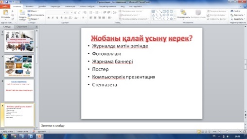 Нұсқаулар Балаларға жобаны қалай жасауға болатындығын түсіндіріңіз. Мысалы: Компьютерлік презентация арқылы. Алайда, кітапта басқа да түрлер берілген: