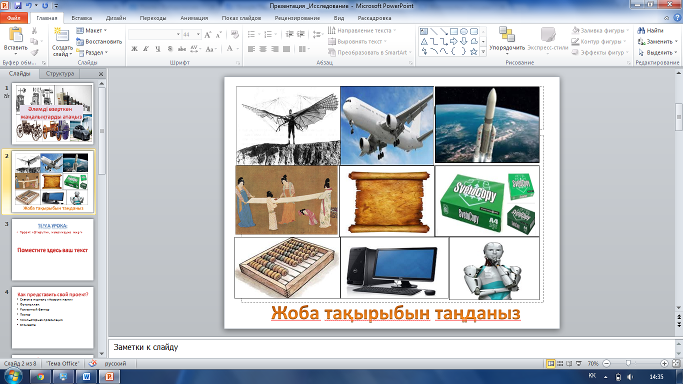 Тағы қандай жаңалықтарды қоса аласыздар? Оқушылардың ықтимал жауаптары: - Біріншісі – компьютер, одан кейінгілері теледидар, ұшақ т.б. Мұғалім: - Бүгін біз «Әлемді өзгерткен жаңалықтар» жобасы бойынша жұмысты бастаймыз. Сіз табылған жаңалықтар ішінен біреуін таңдаңыз және жоба түрінде осы ақпаратты жасайсыздар. Мысалы, презентация құру.