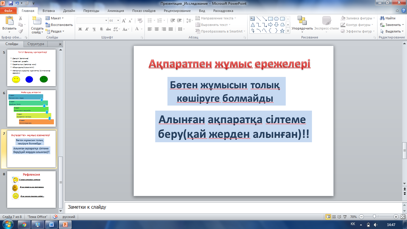 Мұғалім: Ақпаратты іздеу кезінде қажетсіз ақпараттар көп болуы мүмкін. Осыған байланысты ең қажетті деген идеяларды жинаңыз. Енді мен сіздерге ортақ қалтада ақпаратты сақтай отырып, онымен бірге жұмыс істеу мүмкіндігін көрсетемін.