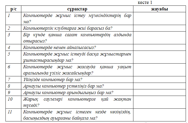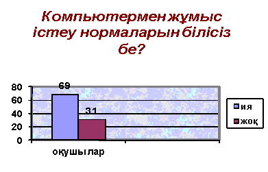 Өкінішті, мен келесі «Арнайы компьютерлік столыңыз бар ма?» деген сұрақ қойып мынадай нәтиже алдым: көпшілігінде арнайы столдар мен орындықтары жоқ, яғни адамның бұлшық еті мен арқасының әр түрлі қисайуына әкелуі мүмкін. Қанша уақыт оқушы, мұғалім және басқалар компьютерде өткізеді? Мамандармен белгіленген уақыты сақтала ма? Келесі нәтиже мені көңілдендіреді, негізгі (57%) компьютермен бір сағаттан аз (тек қана сабақта) айналысады және компьтермен жұмыс нормасын жақсы біледі (65%).