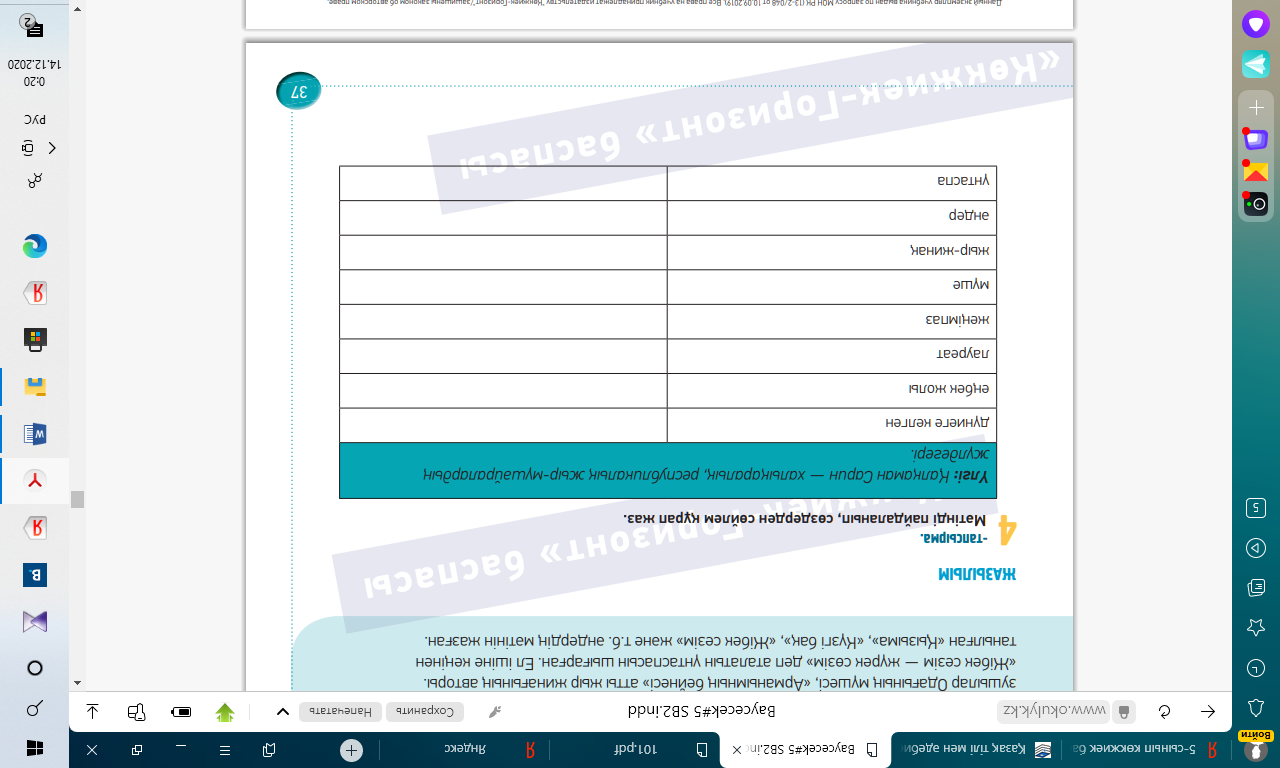 1.Сөздікпен жұмыс. Жаңа сөздермен таныстырады, оқушыларға қайталатады, жаңа тақырыпқа байланысты сөздіктермен жұмыс. Айтылым. тапсырма Айтылым Жеке жұмыс ЕББҚ:(Зейін тапшылығы және гипербелсенділік синдромы (ЗТГС) (даралап оқыту тәсілі арқылы) Тапсырма орындауда «Аяқталмаған сөйлем» әдісі қолданылады. Жеке қажеттілгі бар оқушы (төмен деңгейлі)«қолдау» әдісі арқылы саралау жүргізіледі. Айтылым Топтық жұмыс 12- тапсырма. Сергіту сәті Қосымша тапсырма Жазылым Жеке жұмыс 13-тапсырма Айтылым 10- тапсырма Жеке жұмыс Жазылым Оқылым 9-тапсырма Жазылым Жазылым 8-тапсырма Ойтаразы Айтылым |