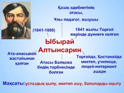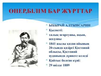 Тыңдалым,айтылым. Арба-повозка, телега Дүниені кезу-блуждание по миру Өнер-искусства Білім-знание Айтайық 5 5 1 әдісі арқылы үш қатардағы сөздерді пайдаланып, сөйлем құрыңдар. Өнер,білім,жұрттар,хабар,адам,от,су,бата,арба,арман,хат,құс Айтылым 1.Алыс жерлерден жылдам хабар алғызатын нелер? (Қазіргі уақытта телефонмен, телеграммамен, әлеуметтік желілердегі хабар алмасу - СМС,мессенджер 2. Мың шақырым жерлерге күн жарымда жететін қандай арба? (пойыз, электр пойызы) 3. Адам неге құстай ұшады? ( Қанаты болмаса да, ұшақтың көмегімен ұшып, барар жеріне жетеді) Оқылым Дереккөздерден автор туралы ақпарат тауып, мәліметтер жина. Сол материалдар бойынша Ы.Алтынсарин туралы қысқаша хабарландыру мәтінін жаз. Сергіту сәтін орындайды.