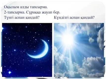 әдісі Сұрақтарға жауап бер.Аспан әлеміне қатысты сұрақтар құрастырып, бір- біріне қояды. Диалогты толықтырыңдар. «Ойлан, жұптас, бөліс» әдісі. Айтылым «Бес сұрақ» әдісі. Әр топ 5 сұрақтан дайындайды. 1 – топ: 1. Аспанның Солтүстік жарты шарындағы шоқжұлдыз. (Жетіқарақшы) 2. Жетіқарақшыға ұқсас тағы бір шөміш. (Кішіқарақшы) 3. Темірқазыққа байланған жылқылар. (Ақбозат пен Көкбозат) 4. Күн көрінісімен жоқ болатын жұлдыз. (Шолпан) 5. Керуен жұлдызы деген атқа ие жұлдыз. (Шолпан) 2 – топ: 1. Жұлдыздарды зерттеу үшін қолданылатын құрылғы. (Телескоп) 2. Аспанға, жұлдызға қарап ауа райын болжаушылар. (Жұлдызшылар) 3. Ең жарық жұлдыз? (Сүмбіле) 4. Таң алдында туатын жұлдыз. (Шолпан) 5. Телескоп не үшін керек? (аспан әлемін зерттеу үшін) Айтылым