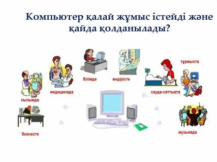 Айтайық Суреттерге қарап, ақпараттық технологияның қолданылатын орындары туралы айт. Оқылым Мәтінді оқы. Мәтін бойынша берілген сұрақтарға жауап беріңдер. Мәтін бойынша сұрақтар: Компьютер не ретінде қолданылды ? .... (Есептеуіш құрылғы) Компьютерлер қайда тұрады ? .... (кеңседе) Компьтерді не ретінде пайдаланады ? ...(ақпараттық құрал) Алғашқы компьютерлер не болып саналды ? ... (Мәлімет қоры) Компьютерлер арқылы не жасауға болады ? ... (төлемдер) Сергіту сәтін орындайды. «Көңілді күн» әні Айтылым Полилог. «Егер компютер болмаса ...» тақырыбында пікір алмасыңдар.