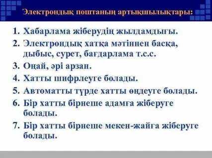 әдісі Оқылым Диалогті рөлге бөліп оқыңдар. Мәтінге тақырып қойып, жоспар құр. Айтылым «Компьютер алдында отырған кезде нені ескеру керек?» бейнеролигін көріп, негізгі ой мен идея анықталады. Бейнеролик бойынша сыныптастарыңа жазбаша кеңес береді. Жазба жұмысында ыңғайлас және қарсылықты жалғаулықтардың болуы шарт. Жазылым Үлгіге қарап, мәтіннен тәуелдік жалғаулы сөздерді тап. Оны тіркесіп тұрған сөздерімен бірге теріп жаз. Үлгі: сенің электронды поштаң. Айтылым Мәтіндегі қою қаріппен жазылған сөздерге сұрақ қой. Жаңа сөздердің аудармасын тап. Айтылым Электронды хат – компьютер желісі арқылы жіберілетін мәтін және кескіндеме. Электронды пошта ... пайдалану үшін келісім шарт ... отыруыңыз керек. Электронды поштаны пайдалану құқығы жеке тұлға ... беріледі. Қолданылатын электронды пошта тіркелген мекен жай ... орнатқан соң, электронды пошта хабарламаларын жіберіп және алып тұруға болады. |