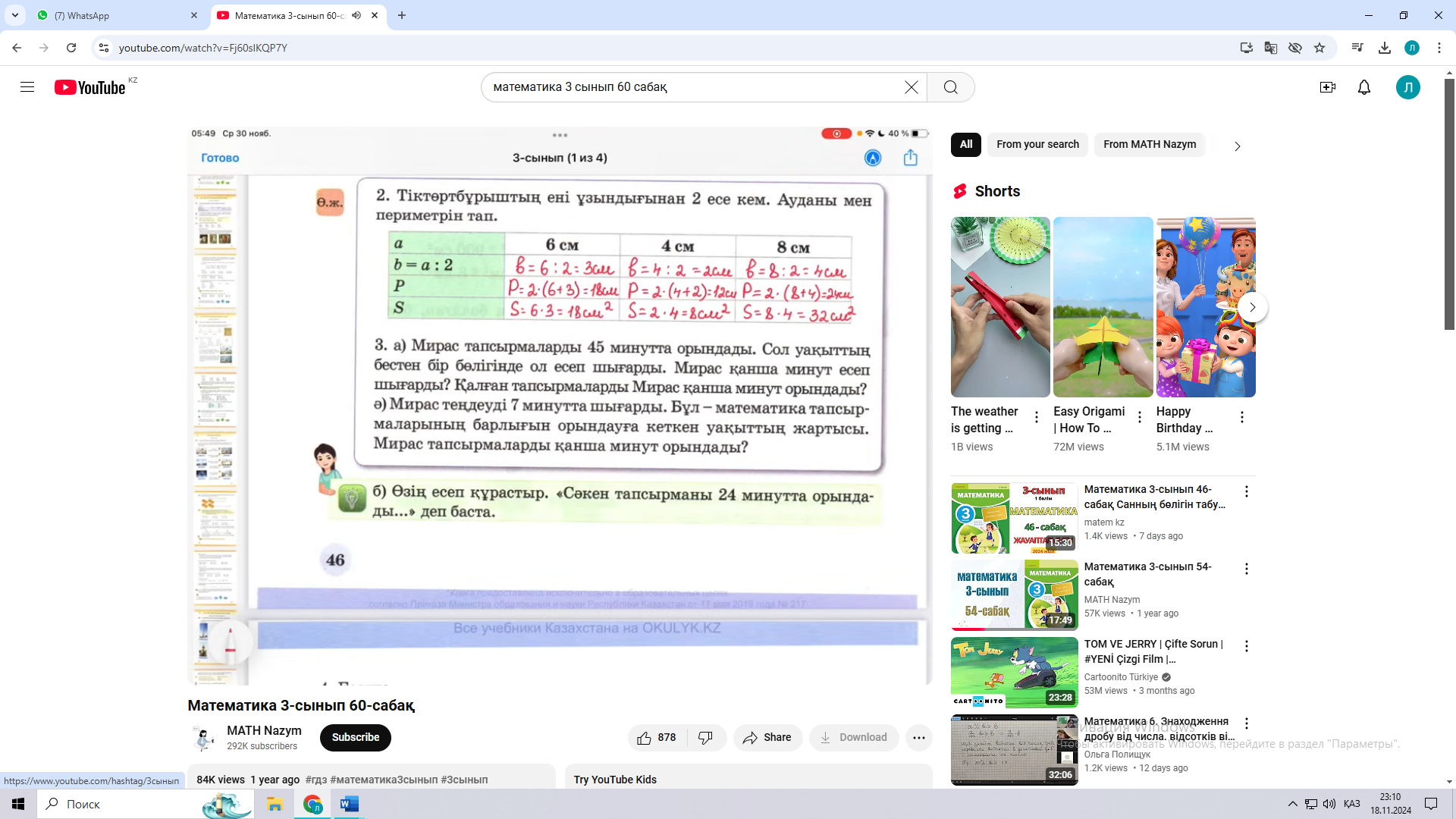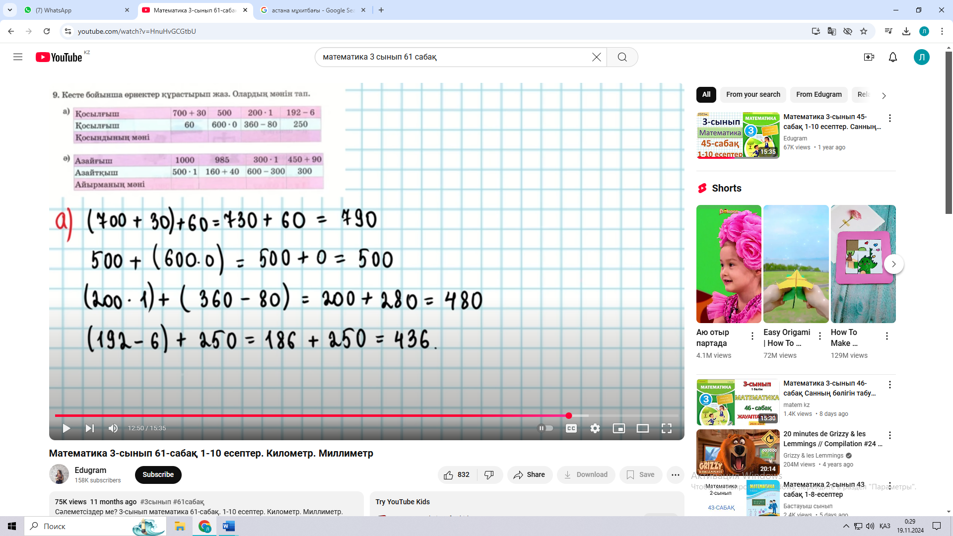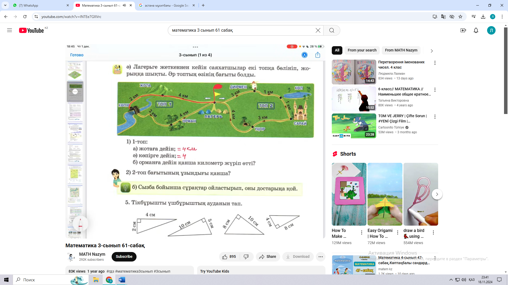 Барлығы - ? мм Ш: 8 * 5 : 1 = 40 мм Ж: 40 мм Ә) 21 м – 3 бөлік 1 бөлік - ? м Ш: 21 м : 3 = 7 м Ж: 7 м Б) Ақкекіре– 3 бөлік Бақытгүл - ? , 6 есе артық Ш: 9 * 6 = 54 Ж: 54 бақытгүл өсіп тұр Г) Қарақат – 28 түп Таңқурай – 4 түп Ш: 28 : 4 = 7 Ж: қарақатқа қарағанда таңқурай 7 есе кем 9 А) ( 700 + 30 ) + 60 = 730 + 60 = 790 500 + ( 600 * 0 ) = 500 + 0 = 500 ( 200 * 1 ) + ( 360 – 80 ) = 200 + 280 = 480 ( 192 – 6 ) + 250 = 186 + 250 = 436 Ә) 1.000 – ( 500 * 1 ) = 1.000 – 500 = 500 980 – ( 160 + 40 ) =980 – 200 = 780 ( 300 * 1 ) – ( 600 – 300 ) = 300 – 300 = 0 ( 450 + 90 ) – 300 = 540 – 300 = 240 |