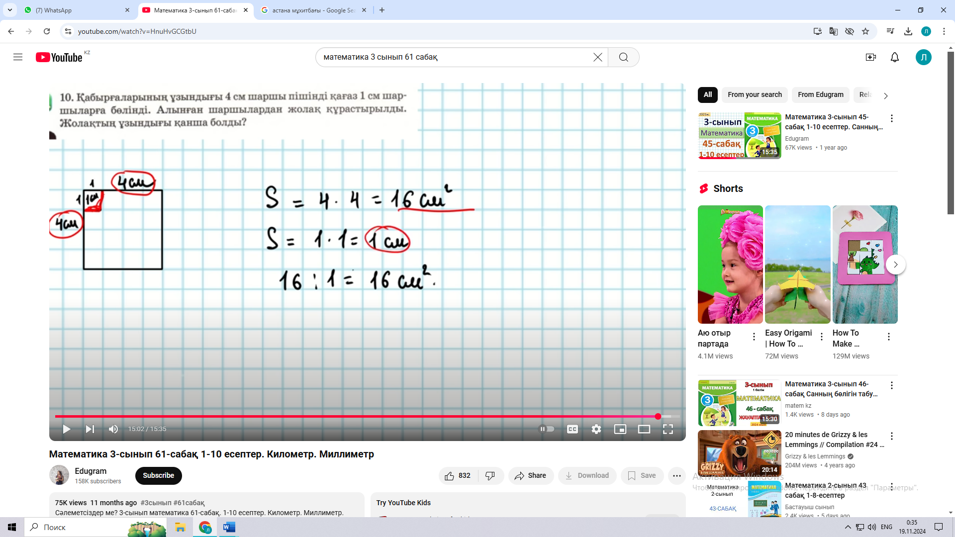 Сабақты бекіту Зертте Жызылым; 51 бет 10 есеп Қабырғаларының ұзындығы 4 см шаршы пішінді қағаз 1 см шаршыларға бөлінді. Алынған шаршылардан жолақ құрастырылды. Жолақтың ұзындығы қанша болды? Үйге тапсырма: 50 бет 6 есеп |