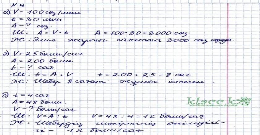4.5.1.2 есептерді шығаруда жұмысқа жіберілген уақыт, атқарылған жұмыс, өнімділік/ егіннің түсімділігі, ауданы мен массасы/ жылдамдық, арақашықтық, уақыт/ биіктік, ені, ұзындық, көлемі шамаларырының өзара тәуелділігін пайдалану |