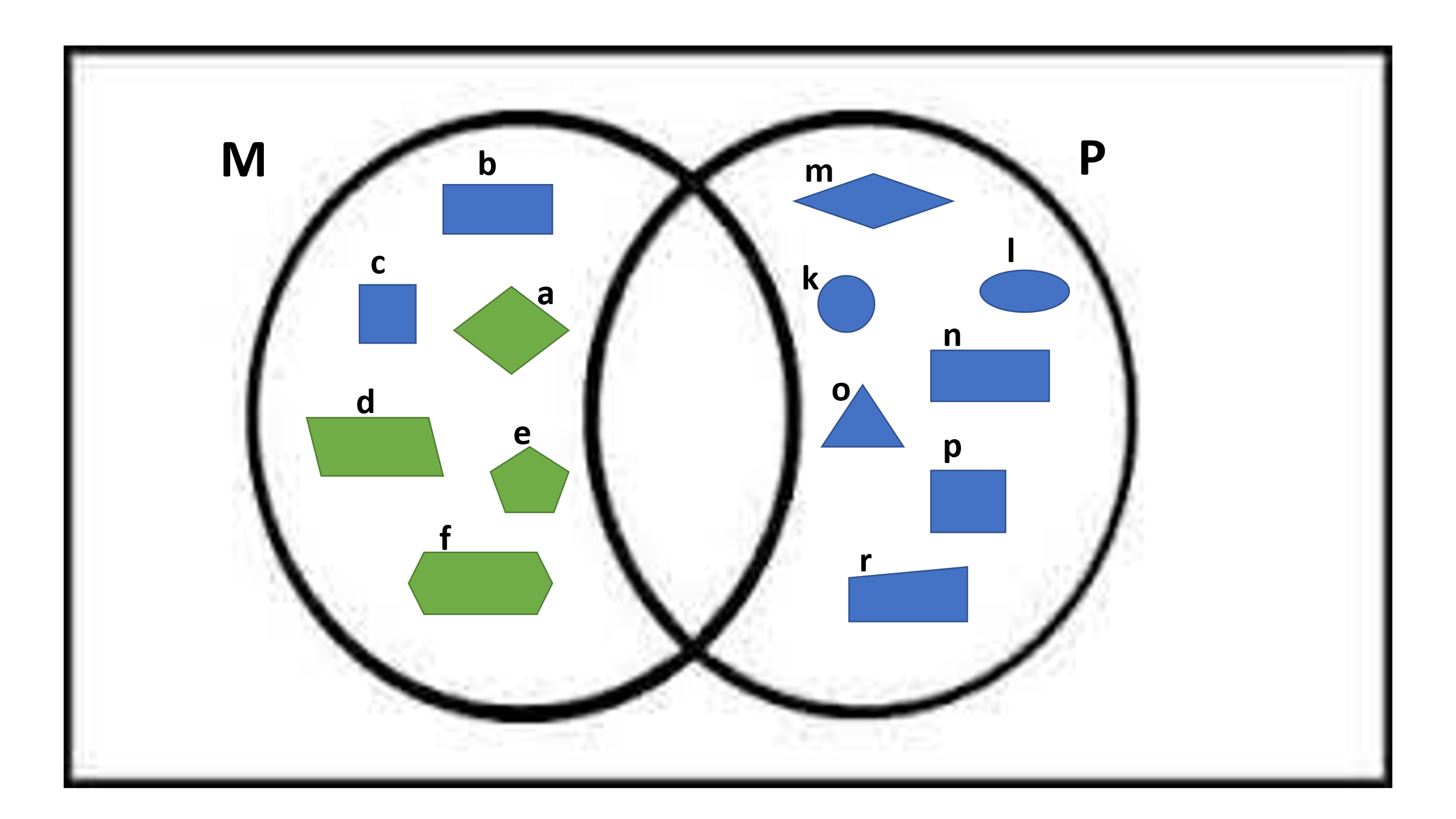 2.4.1.3. Жиындар мен олардың элементтерін диаграммада белгілеу, элементтердің жиынға жиындардың бірігуіне және қиылысуына тиістілігін анықтау. 2.5.2.2. Жиынды белгілеу үшін латын әліпбиінің бас әріптерін, жиын элементтерін белгілеу үшін латын әліпбиінің кіші әріптерін, жиынға тиістілігін және тиісті еместігін белгілеу. |