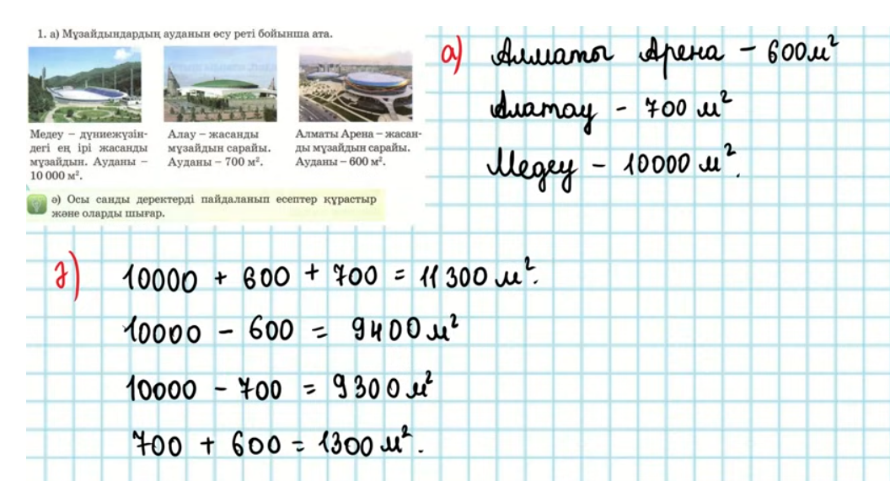 Көркем жазу 1.400 1.400 1.500 1.500 Оқулықпен жұмыс 1 тапсырма «Ой қозғау» әдісі Жазылым; 57 бет 1 есеп А) Мұзайдындардың ауданын өсу реті бойынша ата.