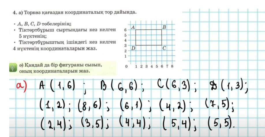 63 сабақ. Нүктенің координаталары және қозғалыс бағыты. «Білімін қорытады» әдісі Жазылым: 55 бет 4 есеп А) Торкөз қағаздан координаталық тор дайында А, В, С, D төбелерінің; Тіктөртбұрыш сыртындағы кез келген 5 нүктенің; Тіктөртбұрыштың ішіндегі кез келген 4 нүктенің координаталарын жаз |