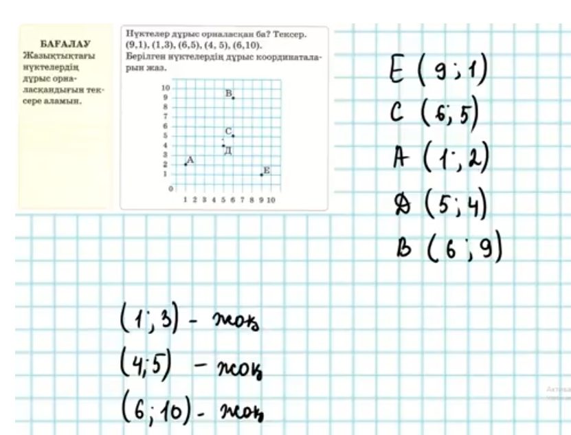 Нүктелер дұрыс орналасқан ба? Тексер. ( 9, 1 ), ( 1, 3 ), ( 6, 5 ), ( 4, 5 ), ( 6, 10 ). Берілген нүктелердің дұрыс координаталарын жаз.