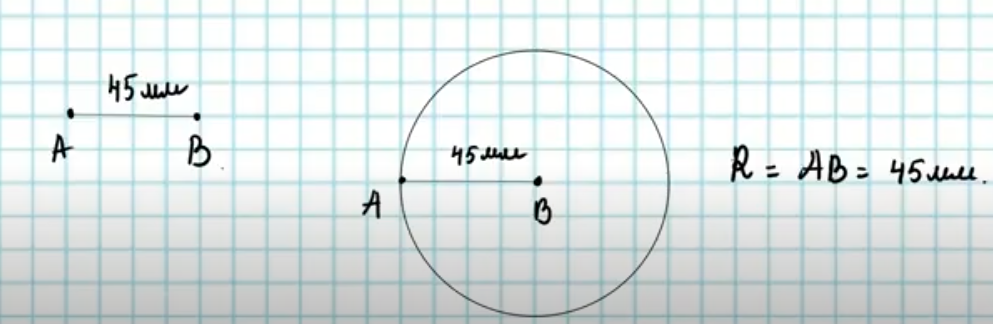 сала аламын Ұзындығы 45 мм болатын кесінді сыз. Оның ұштарын А және В әріптерімен белгіле. А нүктесінен радиусы кесіндінің ұзындығына тең щеңбер сыз