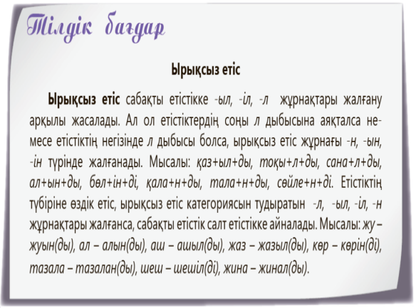 6.2.7.1 – энциклопедия, сөздік, балаларға арналған газет-журналдардан қажетті ақпараттарды алу, авторына сілтеме жасау 6.4.4.3 - үстеудің мағыналық түрлерін ажырату, синонимдік қатарларын түрлендіріп қолдану |