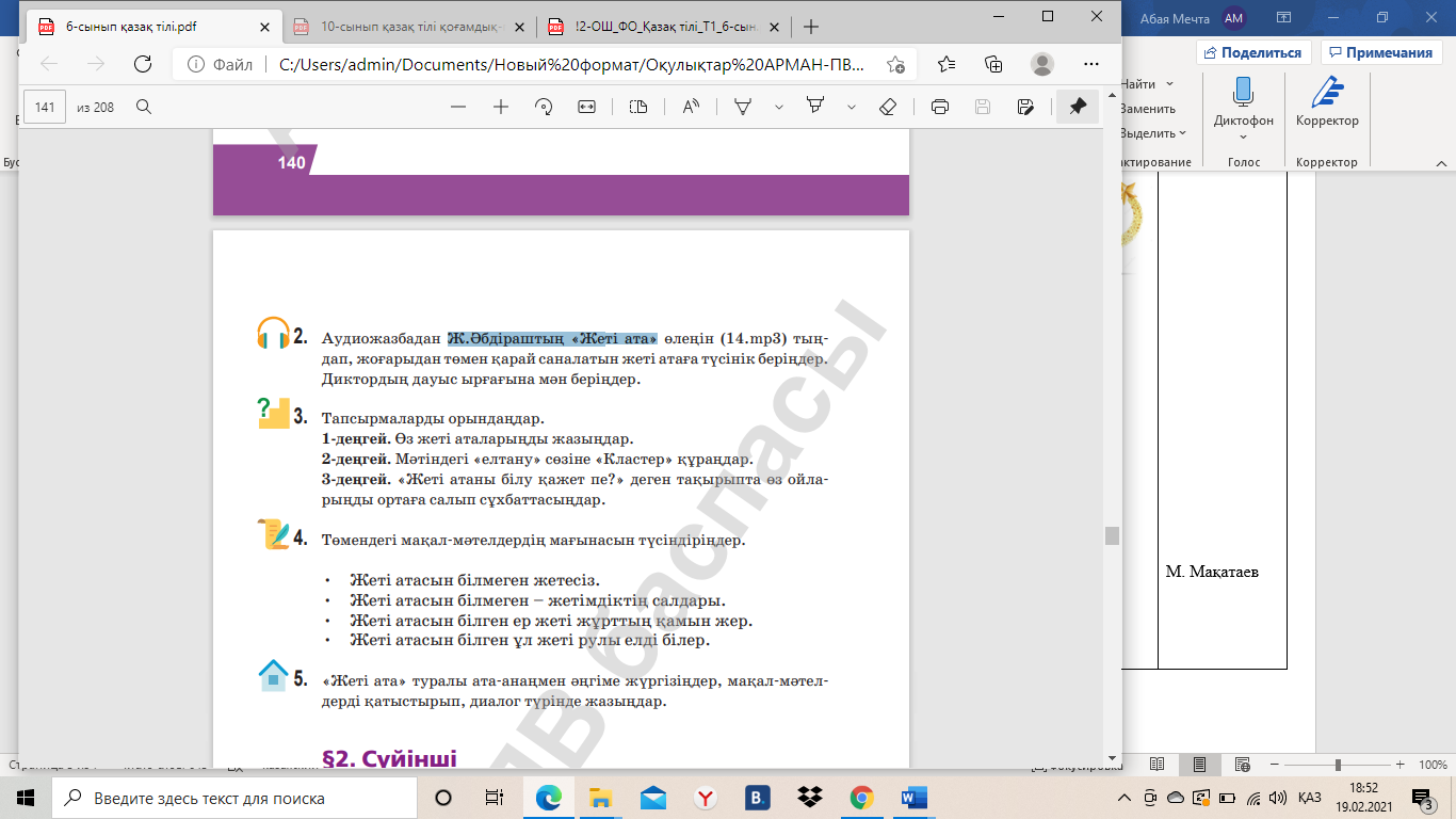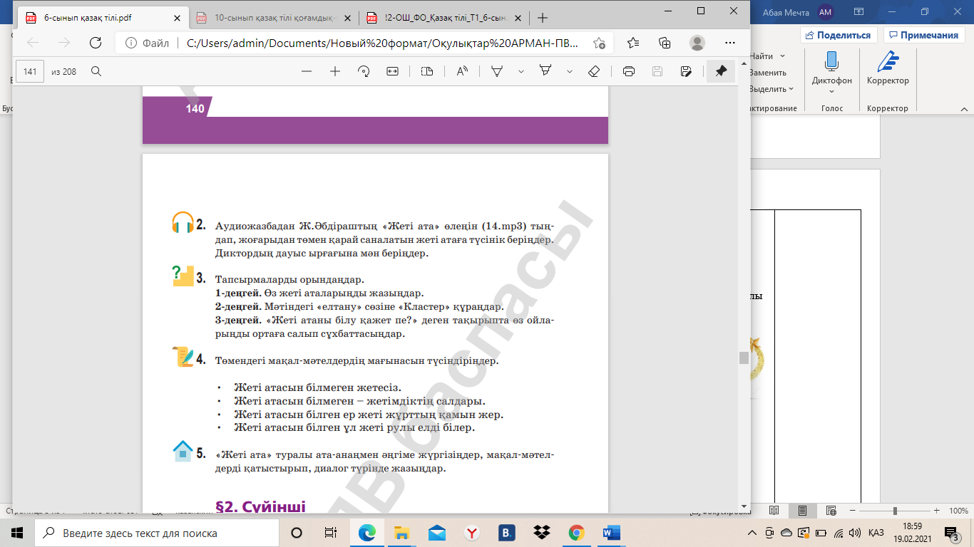 1.Мәтіннің алғашқы бөлігін мұқият тыңдаңыз. Мәтіннің не туралы болатынын болжап, өз болжамыңызбен салыстырыңыз. Жеті атаны білуіміз керек 1-бөлік. Өз ұрпағына жеті атасын үйрету атадан балаға жалғасып келе жатқан қазақтың тәрбиелік дәстүрі екені баршаға аян. Мұның қандастық жағынан алғанда үлгі боларлық зор қызметі мен маңызын халқымыз ерте түсінген және оны берік ұстанып келген. Енді осы қағиданың терең тамырына көз жіберіп көрейік. (Осы жерден тоқтатылып, оқушылар болжамы тыңдалады) 2-бөлік. Біріншіден, жеті ата тәртібі туыстық, ағайындық бірлікті, ынтымақты ұстана отырып, бір ауыл, бір бауыр болып өмір сүрген. Бір рудың адамдары осы күнге дейін бір жерде мекендеп келе жатыр. Екіншіден, жеті атаға дейінгі туыс-туғандардың тұрмыс-тіршілігі де, күнкөрісі де, тұрған жер, суы да, өріс, қоныс, жайлауы да қысы-жазы қатар немесе бірге болады. Қиындықта бір-біріне демеуші, қамқоршы-пана, қуанышты да, реніш-қайғыны да бірге көтеріп бөліседі. «Туысы бірдің – уысы бір» деген сөз осыдан шыққан. Үшіншіден... (Осы жерден тоқтатылып, оқушылар болжамы тыңдалады). 3-бөлік. Үшіншіден, бір атадан тараған туыстар мен жас ұрпақтар бірін-бірі жақсы таниды. Ағалы-інілі, апалы-сіңілі дегендей, сыйластықта, бауырмалдықта бірге өседі. Мұндай туыс-туған, жақын-жуықтар арасында орынсыз жанжал, ұрлық-қарлық, барымта, зорлық-зомбылық сияқты жат істер болмайды. Өйткені тәртіп бойынша туыстар бір-бірінің малын ұрламайды. Керісінше, сырттай қамқоршы болып, жақын-жуықтарының мал-жанына көз салып жүреді. Әкелер мен аналар бір кіндіктен шыққан перзенттерін ел, ру намысын қорғайтын ержүрек, қайырымды, қаншыл, ұйымшыл, бауырмал етіп тәрбиелейді. «Қанына тартпағанның қары сынсын» деп қатты айтатыны тағы бар. Жеті ата ұғымында ағайын арасындағы үзілмес бірлік, бұзылмас тектік тәрбие-тәлімі өте зор және бұл әдемі, ұтымды тәсілдермен жасалған.