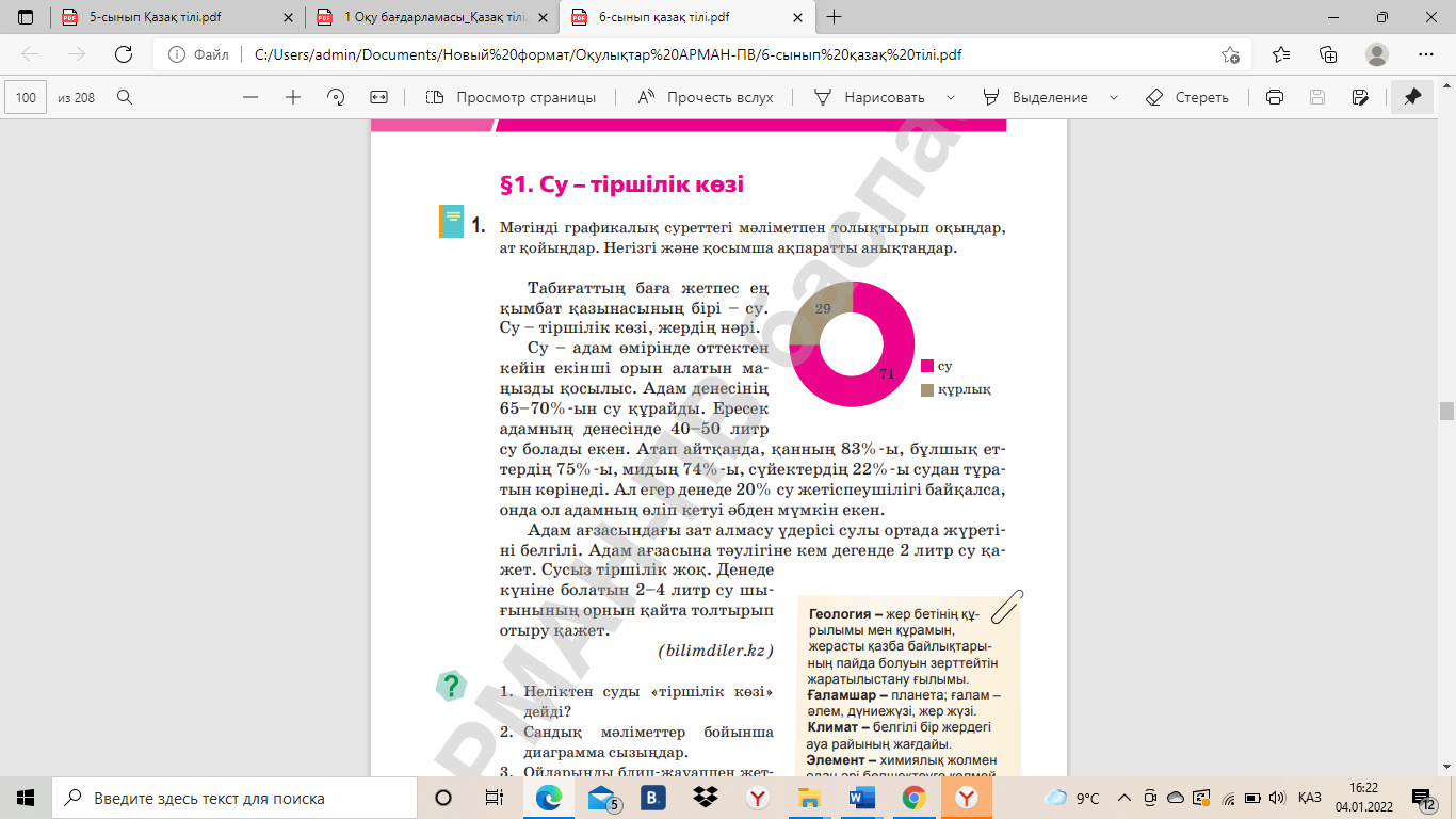 3-тапсырма. «Тіршілік» сөзін қалай түсінесіңдер? Тіршіліктің пайда болуында судың рөлі қандай? Оқылым мәтіні деректері бойынша судың адам үшін және табиғат үшін маңызын салыстырыңдар.