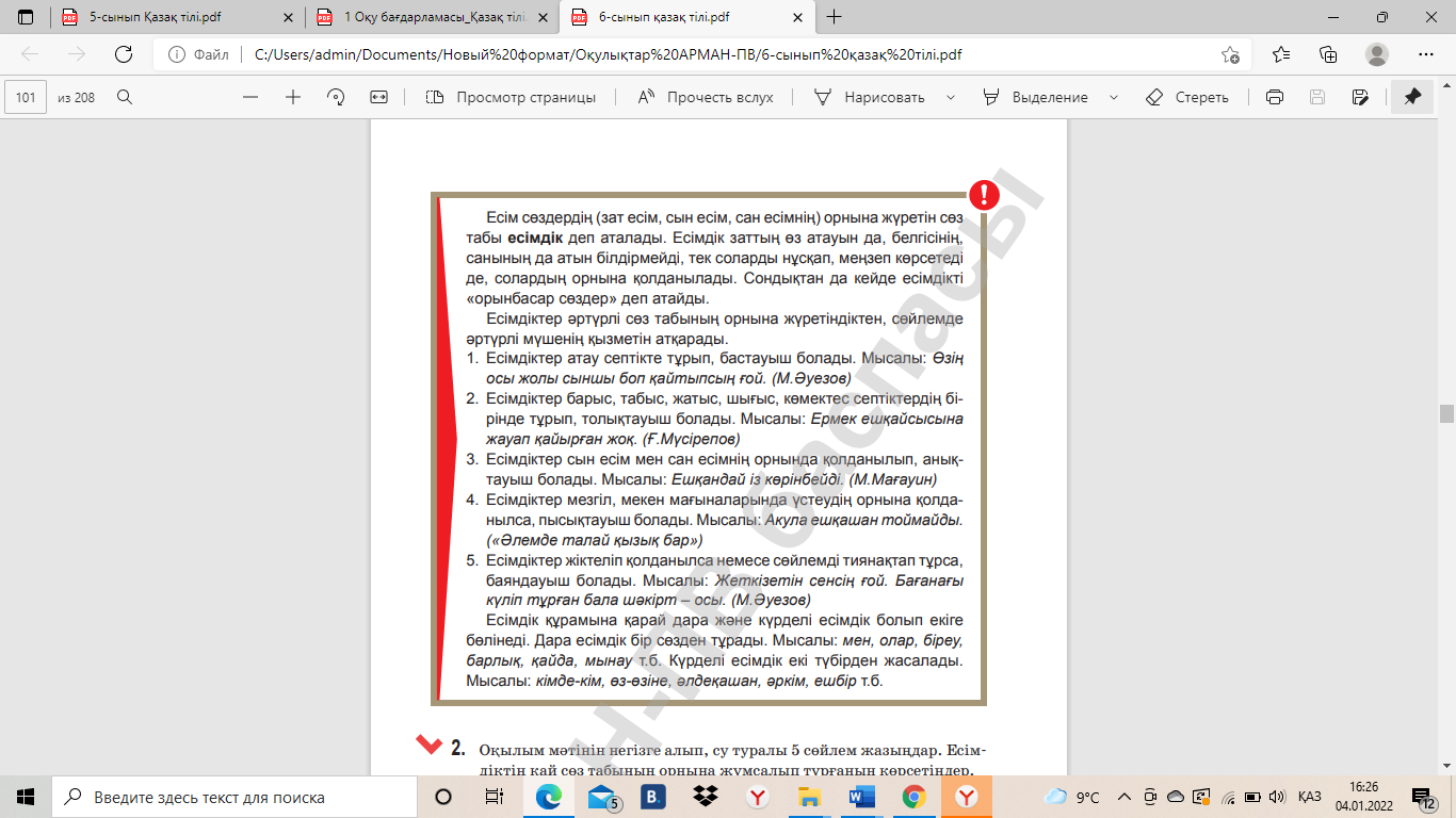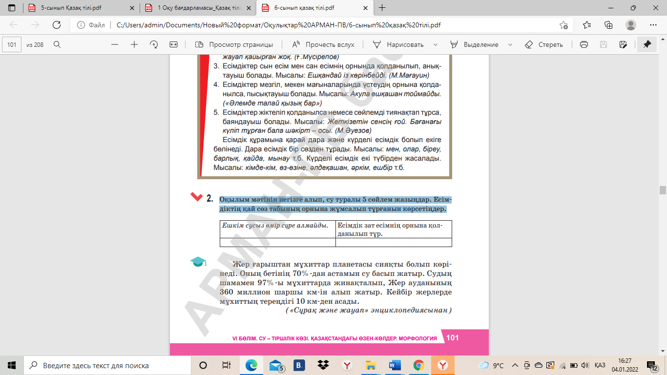 2-тапсырма. Оқылым мәтінін негізге алып, су туралы 5 сөйлем жазыңдар. Есімдіктің қай сөз табының орнына жұмсалып тұрғанын көрсетіңдер.