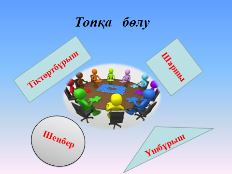 Оқулықпен жұмыс Жұптасып,топтасып жұмыс істейді,әр оқушы өз ойларын қосады,бірігіп атқарған жұмыс нәтижесін бір оқушы көрсетеді.