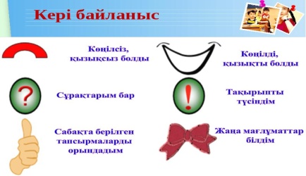 Рефлексия: Мұғалім «Жағымды сөздер» тәсілі бойынша сабақтың қалай өткендігін анықтайды. Ол үшін балаларға мынадай сұрақ қояды: - Балалар, сабақ барысында қандай жағымды сөздер естідіңдер? Жауаптың нәтижесі бойынша сабақ қорытындыланады. Сабақ барысында мұғалім, сыныптастары тарапынан айтылған жағымды сөздерді еске түсіреді, айтады. Желімқағаздарға жазады, тақтаға жапсырады. |