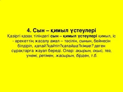 Мәтінді оқиды, сұрақтарға жауап береді, мәтіннен сын-қимыл үстеуін табады. |