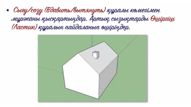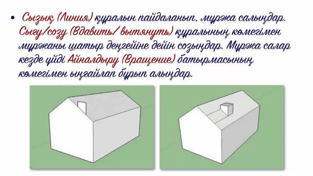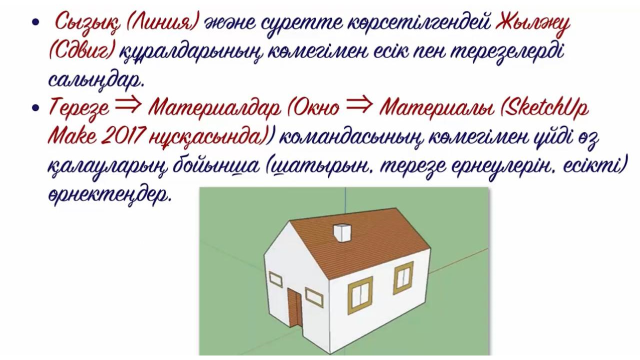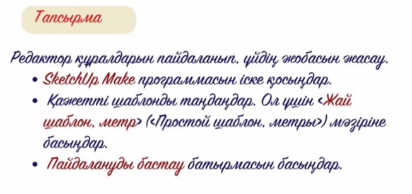 -3D модельдеуге арналған программаны қосады; -қажетті шаблонды таңдайды; -нұсқаулық бойынша үй салады - түстер таңдап бояйды; -құрал саймандарды пайдалана алады; -үйдің есік терезе моржасын салады;