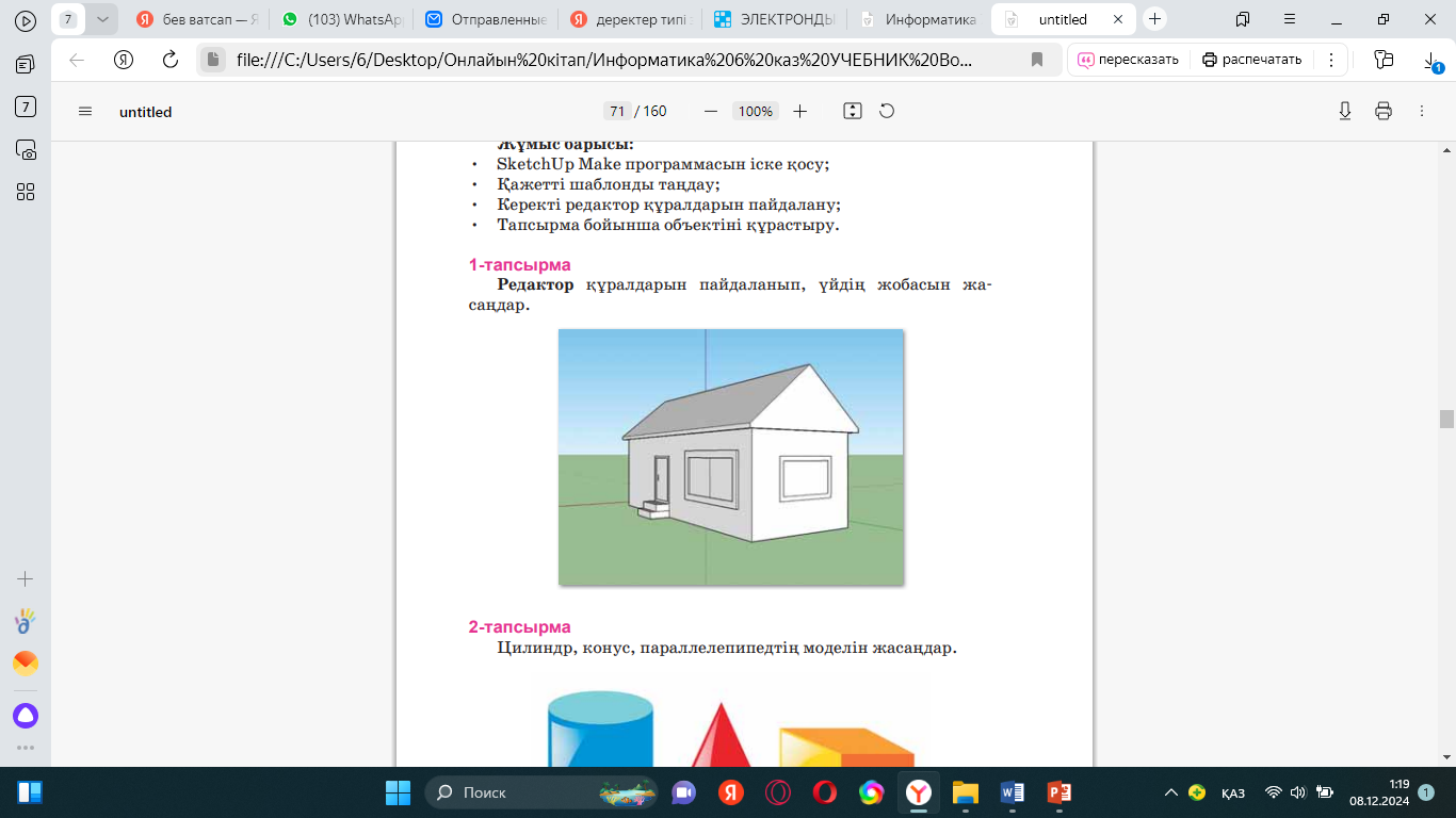 Жобалық жұмыс Жобалық жұмыстың мақсаты: 3D редактордағы обьектілердің модельдерін құру. Жұмыс барысы: - Sketch Up Make программасын іске қосу; -Қажетті шаблонды таңдау: -Керекті редактор құралдарын пайдалану; -Тапсырма бойынша обектіні құрастыру; . Практикалық тапсырма.