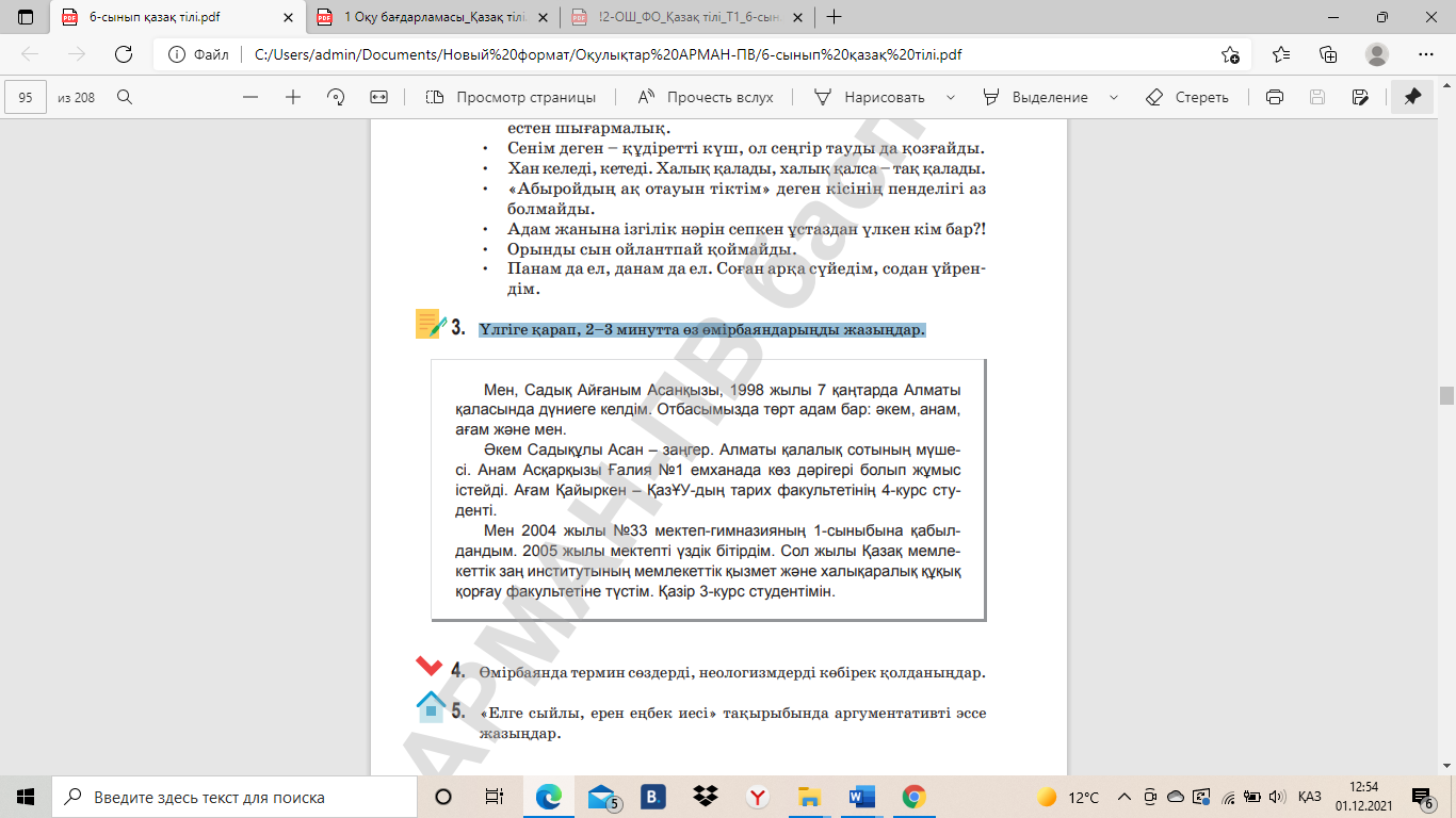 3-4-тапсырмалар. Үлгіге қарап, 2–3 минутта өз өмірбаяндарыңды жазыңдар.Өмірбаянда термин сөздерді, неологизмдерді көбірек қолданыңдар.