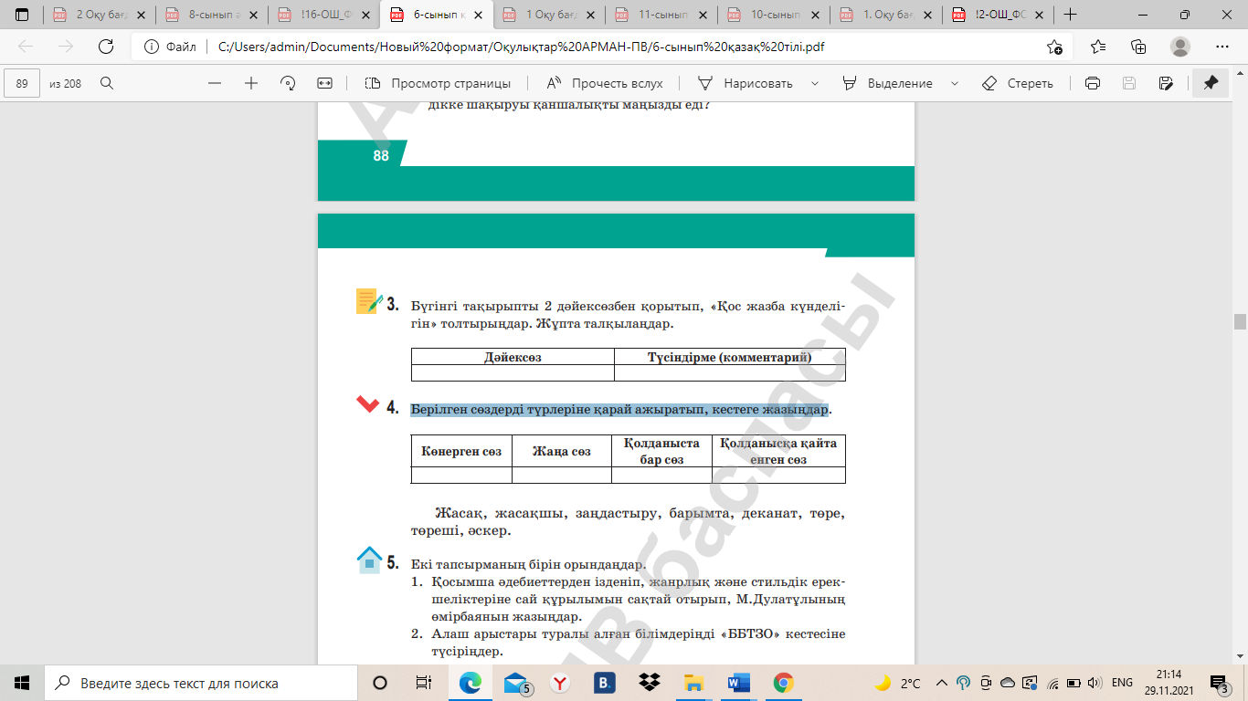 ҚБ ЖАЗЫЛЫМНАН КЕЙІН. ӘТН. 4-тапсырма. Берілген сөздерді түрлеріне қарай ажыратып, кестеге жазыңдар.