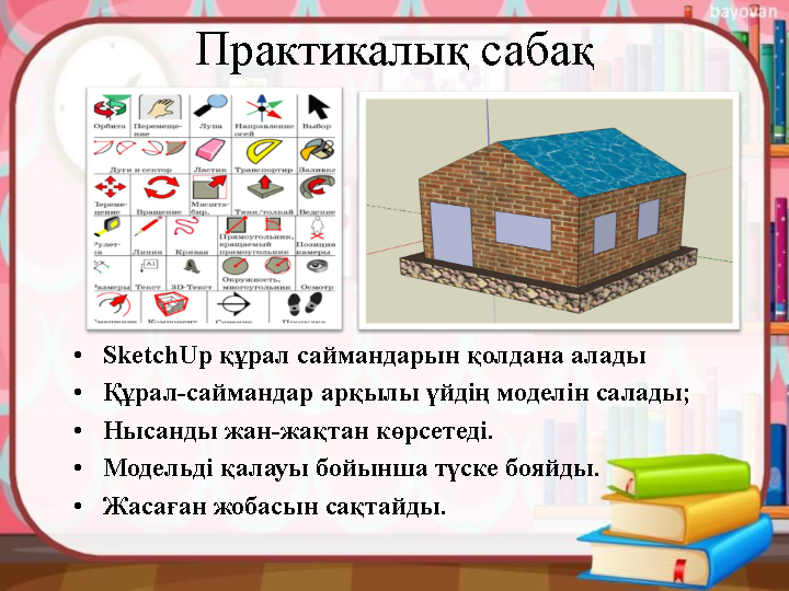 SketchUp программасында пайдаланылатын негізгі құралдармен танысады Дескриптор: -құрал саймандарды қызметімен сәйкестендіреді. - Learning App бағдарламасында тексереді - қандай құралдармен салынғанын анықтайды; -атауын жазады, қызметін түсіндіреді - SketchUp редаторды іске қосады; -SketchUр құрал саймандарын қолдана алады; - SketchUр құрал саймандары арқылы үйдің моделін салады. Дискриптор: -сабақты түсінеді - Wordwall бағдарламасында өткен сабаққа байланысты сұрақтарға жауап береді |