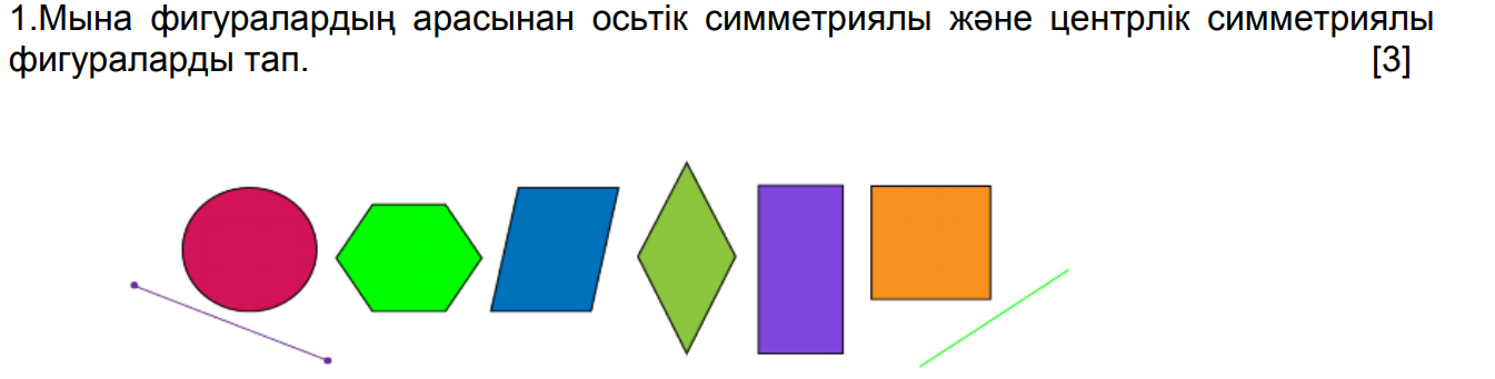 6.3.1.6 осьтік немесе центрлік симметриясы болатын фигуралар туралы түсінігі болуы; симметриялық және центрлік-симметриялы фигураларды ажырату.
