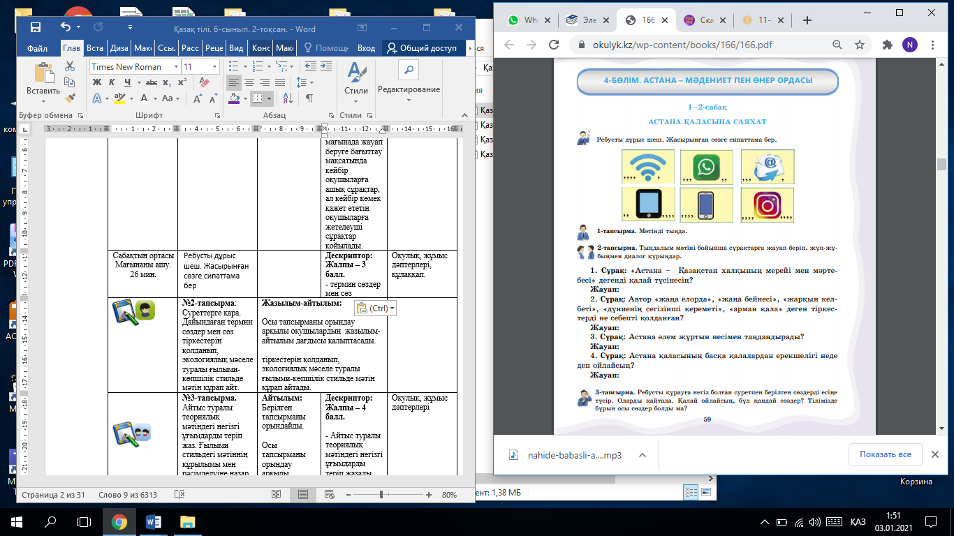 №2-тапсырма: Тыңдалым мәтіні бойынша сұрақтарға жауап беріп, жұп-жұбыңмен диалог құрыңдар. Осы тапсырманы орындау арқылы оқушылардың жазылым-айтылым дағдысы қалыптасады. |