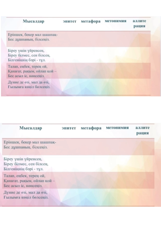 Қорытындылау Өлеңді талдауды үйрете отырып,оның мән мағынасын ашады.Пікірлерін сұрайды. Үй тапсырмасы Абайдың Өлеңдері бойынша кез келген 1шумағына талдау жасайды. |