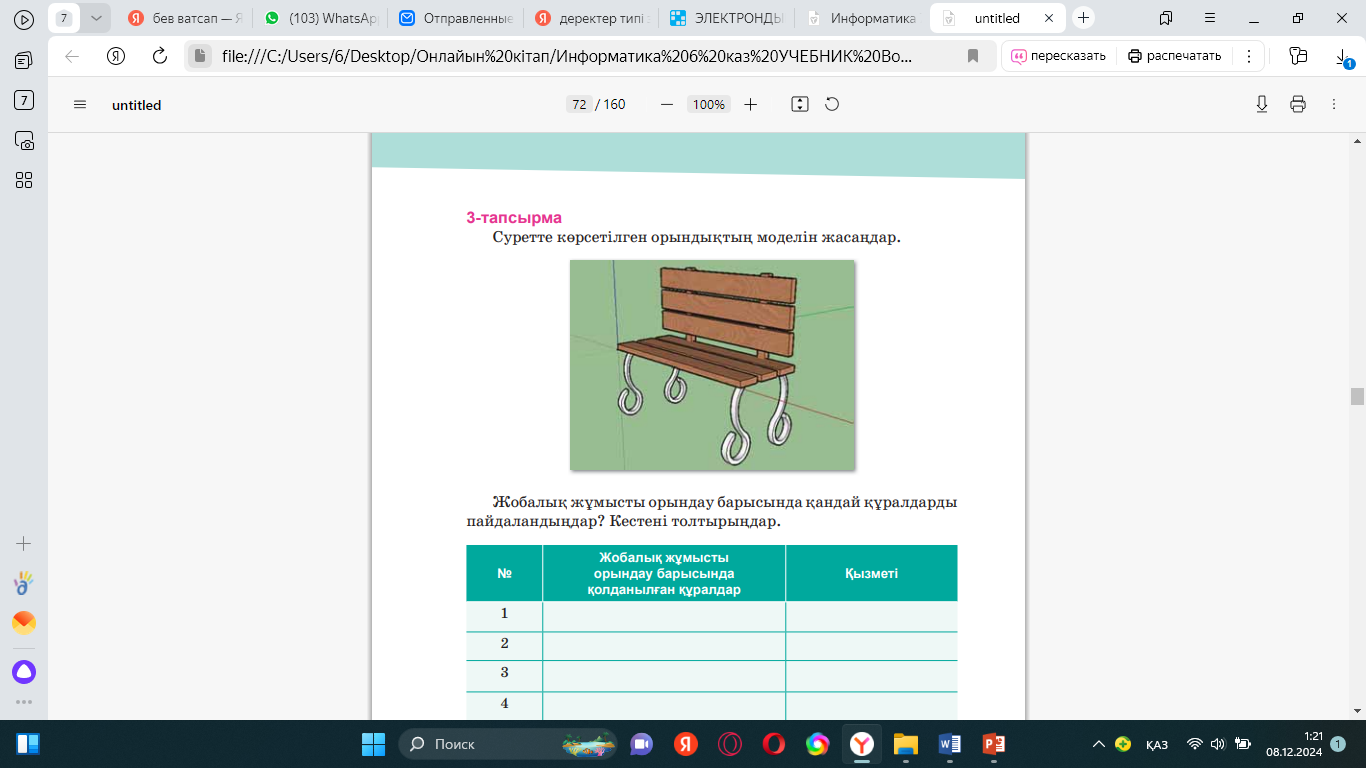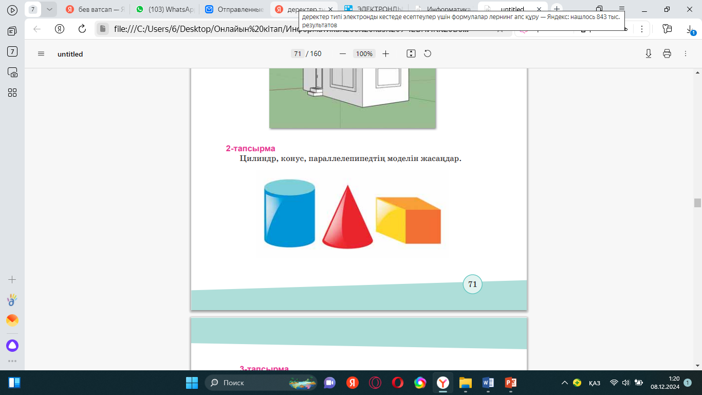 Презентация 3D Конус, цилиндр және сфера құру.pptx Оқулық, А-4 паракша, маркер, стикер Дәптер, оқулық, кесте Ноутбук, оқулық Тапсырма https://wordwall.net/resource/81700598 |