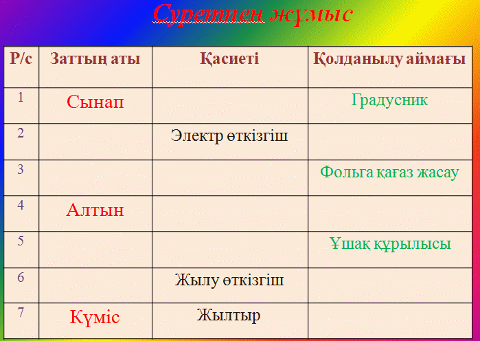 -заттардың атауын жазады – 3 балл; -заттардың физикалық қасиетін жазады – 3 балл; |