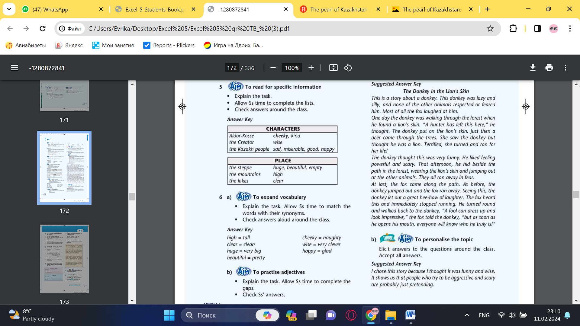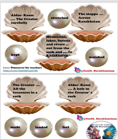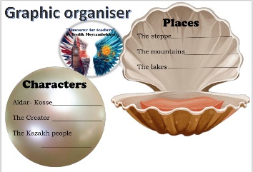 Pupils read the text and answer the question. ANSWERS 1 They were sad because they had no mountains, lakes, forests, etc. 2 Aldar-Kosse was very kind and didn't like to see the Kazakhstani people so miserable. 3 He asked for some mountains. 4 The Creator kept his treasures in a sack. 5 He made a hole in the sack 6 Yes I did/No I didn’t Pupils complete the sentences ANSWERS 1 watched 2 stretched 3 fell, landed 4 kept 5 made Ss should watch the video and imitate actions Pupils complete the graphic organiser with the adjectives. The writer uses in the story. ANSWERS