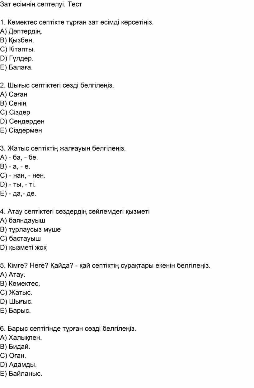ҚБ: Септіктер туралы біліп алды,оларға сұрақ қоя алады-1Б Дескриптор: Тест жауабына -1Б