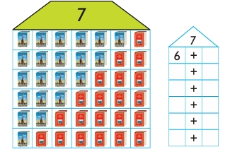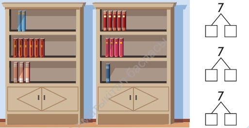 Бірінші сөреде неше кітап орналасқан? (2) Бірінші сөреде 7 кітап болуы үшін неше кітап қою қажет? (5) 2 + 5 = 7 Екінші сөреде неше кітап орналасқан? (6) Екінші сөреде 7 кітап болуы үшін неше кітап қою қажет? (1) 6 + 1 = 7 Үшінші сөреде неше кітап орналасқан? (3) Үшінші сөреде 7 кітап болуы үшін неше кітап қою қажет? (4) 3 + 4 = 7 Екінші шкаф бойынша осылай сұрақтар қояды. Оқушы қорытынды жасайды: әр шкафтың әрбір сөресінде кітаптарды 7-ге толықтырдық, яғни 7 санының құрамын алдық. |