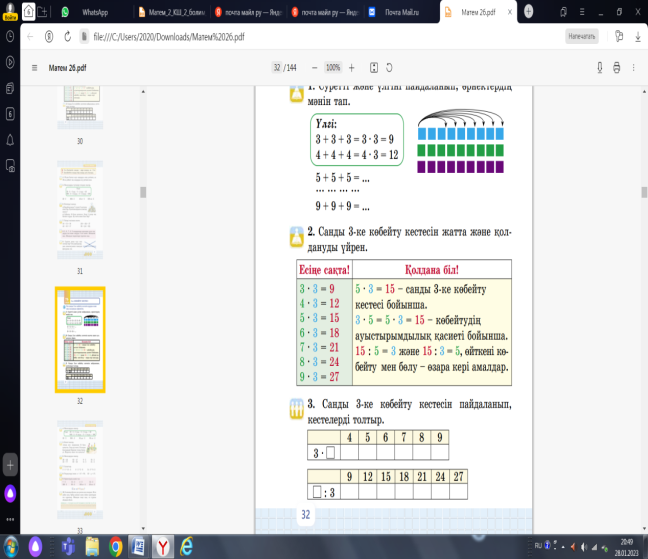 3-ке көбейту кестесінің құрылу жолын түсінеді. Көбейту мен бөлуге берілген есептерді шығару барысында 3-ке көбейту кестесін қолданады. |