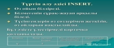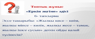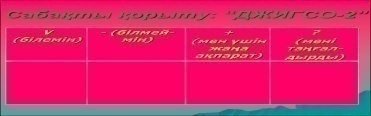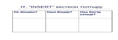Айтылым Интербелсенді тақтада берідген тақырыпқа қатысты сұрақтарды пайдалынып, диалог құрады. Жауап беріп, сұхбаттасады. Оқылым Жазылым Топқа бөлініп, тапсырмаларды орындайды. «Ойыңды дәйекте» ойыны. Әр топ өз дәйектемелерін таңдап, постер қорғайды. Мәтін бойынша сурет салады. «Пирамида» тәсілін пайдаланып, тақырып бойынша сөзден сөз тіркесін, сөз тіркесінен сөйлем, сөйлемнен, мәтін немесе шағын әңгіме құрайды. Оқылым Айтылым Дұрыс нұсқаны таңдайды. «Өзіңізді текеріңіз» тәсілі арқылы мәтін мазмұны бойынша берілген ақпараттардың жалған, рас екенін ажыратып, өз нұсқасын ұынады. Айтылым «ПОПС» формуласын қолданып, мәтіндегі ақпараттар бойынша өз пікірін дәлелдейді. Қорытынды жасайды. |