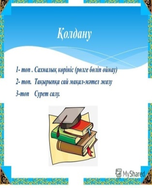 Сөздік жұмысы №1-тапсырма Жеке жұмыс Мұғалім бағыт-бағдар береді. 2-тапсырма Жеке жұмыс Оқушыларды сауаттылыққа баулиды. 3-тапсырма. Топтық жұмыс Мұғалім бағыт- бағдар беріп, қосымша сұрақтар қою арқылы алған білімдерін тереңдетеді. |