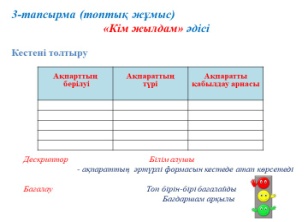 Дескриптор: Жалпы - 4 балл. -Сұраққа жауап береді «Бас бармақ» стратегиясы. Дескриптор 5 балл -Топтастырады -Постер құрады -Түсіндіреді -Мәтінді оқиды «Біз нені білдік?» тәсілі Дескриптор 3 балл -Дәлелдеп айтады -Тірек сөздерді анықтайды «Алма ағашы» тәсілі Дескриптор 3 балл -Сөз тіркесін жазады -Жаңа сөздер жазады «Жылы лебіз, ыстық тілек» тәсілі |