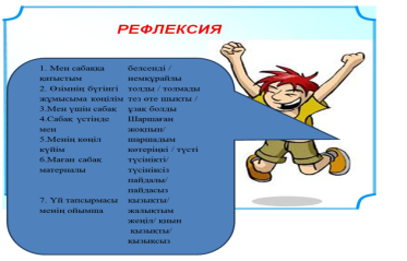 «Еркін микрофон» әдісі. Мұғалім оқушылардың сабаққа деген көзқарасын, рефлексиясын тыңдайды.