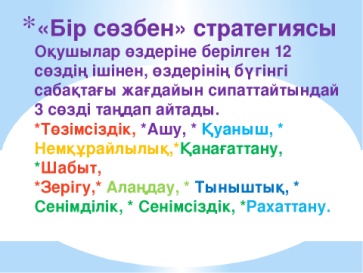 Жеке жұмыс: Оқушылар бір ауыз сөзбен сабақ туралы өз ойларын түсіндіріп береді