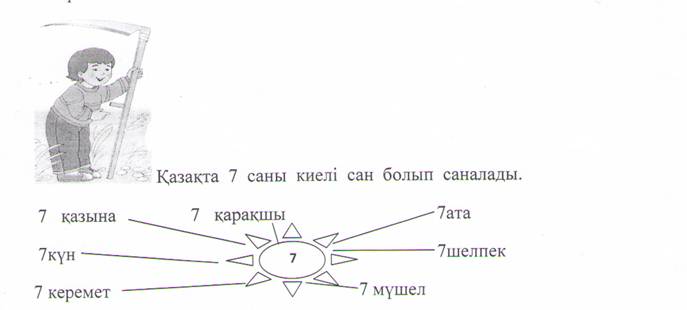 Оқушылардың натурал сан қатарында 7 санының орнын табуды, 7 санының құрамын атай алуын, жазылуын бақылау арқылы бағалау. Санай алатын және санауға киналатын оқушыларды жазып алу, келесі сабақты жоспарлауды ескеру. |